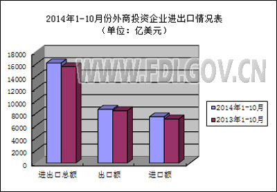 1-10月,外商投资企业出口额8717亿美元,同比增长2.7%,增幅低于同期全国平均水平3.1个百分点;进口额7504亿美元,同比增长5.1%,增幅高于全国平均水平3.5个百分点,投资项下进口自用设备金额80亿美元,同比下降3.4%。
